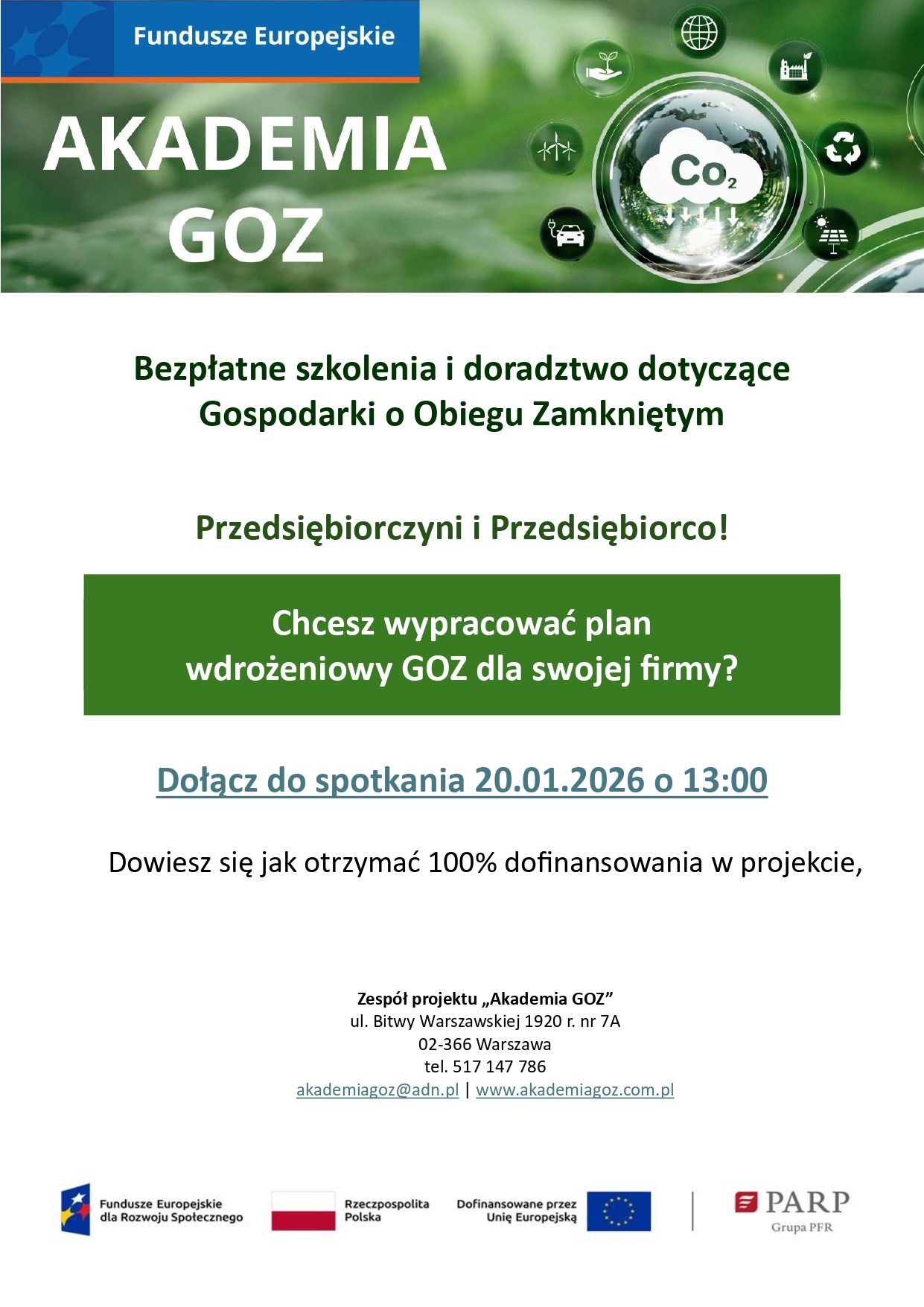 Chcemy zachęcić do udziału w projekcie Akademia GOZ, który jest realizowany przez Krajową Izbę Gospodarczą oraz Instytut ADN sp. z o.o. sp. k. Numer projektu: FERS.01.03-IP.09-0086/23.